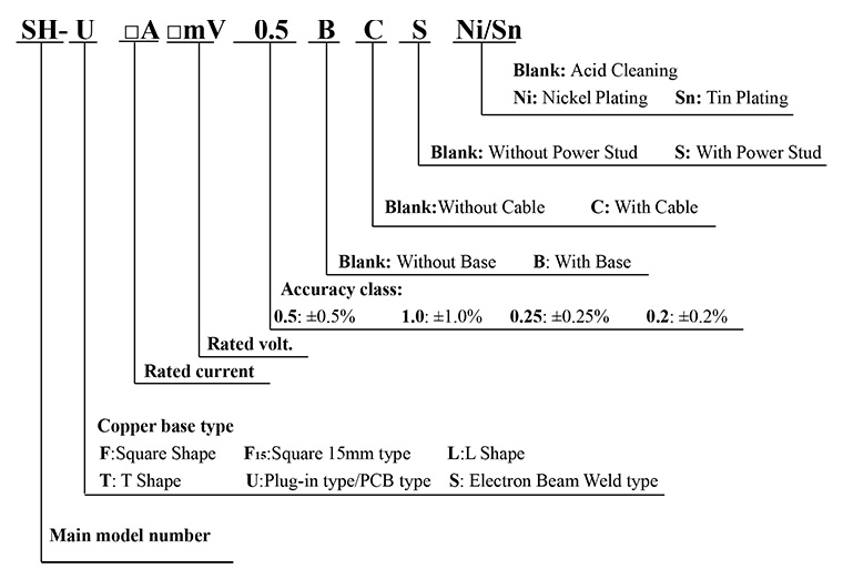 3)Temperature rise: Electrify the shunt with rated current for 2hr, test it after temperature rising stable, the temperature rise should be≤80K when the rated current under 100A; and should be ≤120K when the rated current higher than 100A.