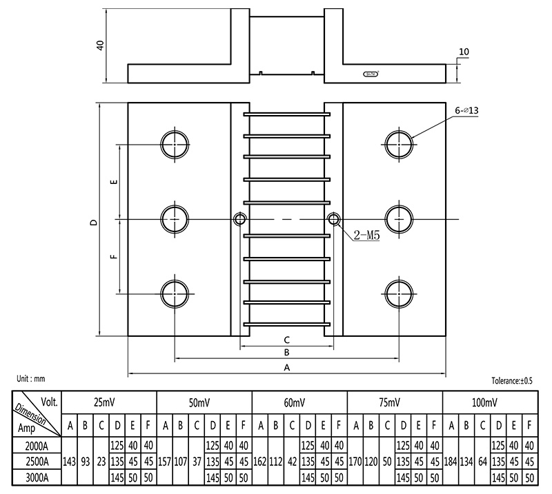 3)Temperature rise: Electrify the shunt with rated current for 2hr, test it after temperature rising stable, the temperature rise should be≤80K when the rated current under 100A; and should be ≤120K when the rated current higher than 100A.