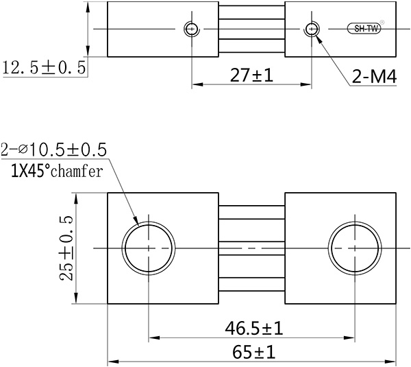 • .Temperature rise: Electrify the shunt with rated current for 2hr, test it after temperature rising stable, the temperature rise should be≤80K when the rated current under 100A; and should be ≤120K when the rated current higher than 100A.